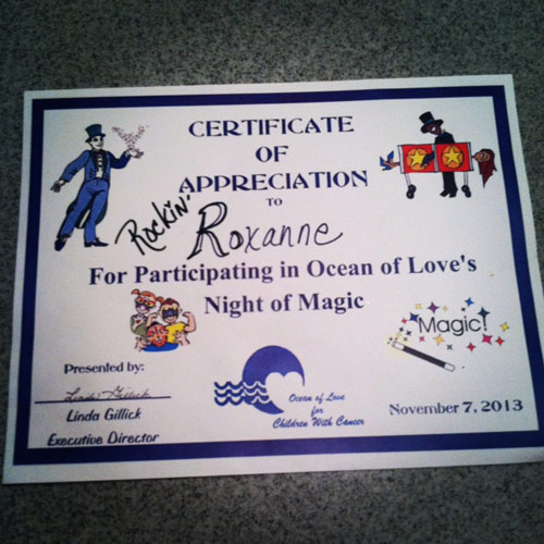 We received this Certificate of Appreciation for participating in Ocean of Love's Night of Magic.